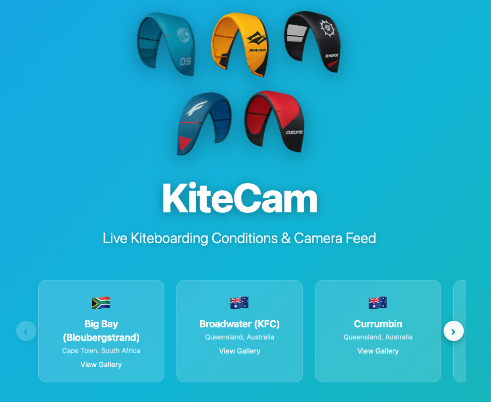 KiteCam is a dual-platform app for iPhone and Apple Watch that taps into the kitecam.com.au network of beach cameras. Each camera automatically captures images throughout the day while the backend measures wind speed and direction from local weather stations. The app pulls all of that together into a clean, beautiful interface you can check in seconds.